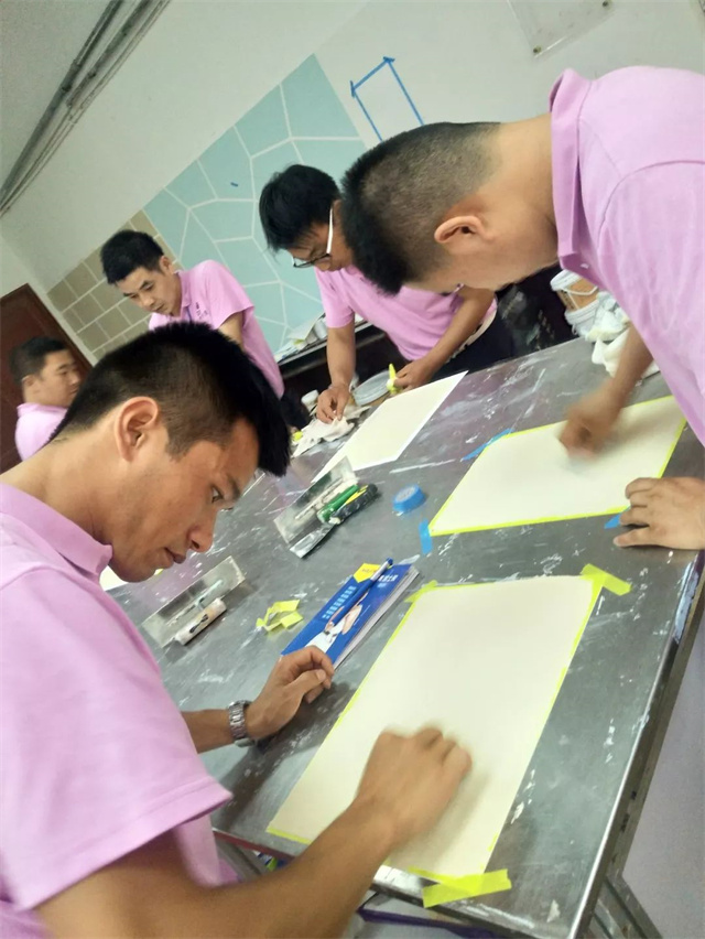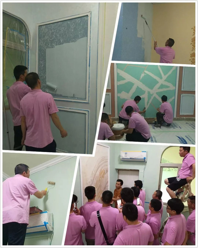 在理論講解以后,美涂士大學(xué)組織各經(jīng)銷商來到實操室親身體驗嘉麗士藝術(shù)漆產(chǎn)品的性能,并按施工流程自己動手制作各系列樣板效果。