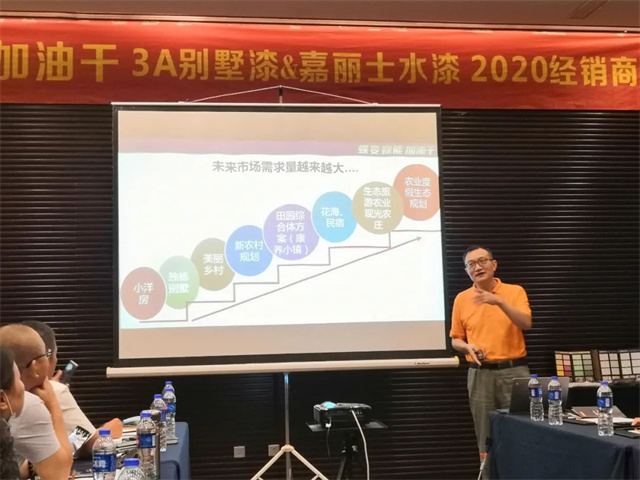 嘉麗士事業(yè)部總經(jīng)理焦坤朋在會上提出,將對傳統(tǒng)乳膠漆+商裝水漆+防水+藝術(shù)漆產(chǎn)品的優(yōu)化升級,成立商裝水漆推廣小組幫扶經(jīng)銷商,完成工程工裝的雙包涂裝,并根據(jù)實際情況,對大型工程項目給予幫扶支持。