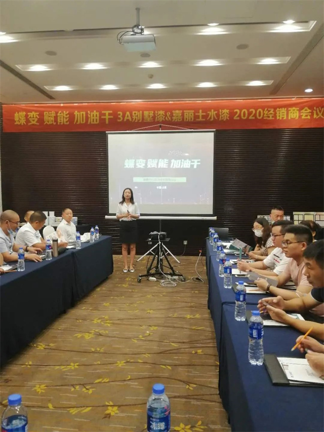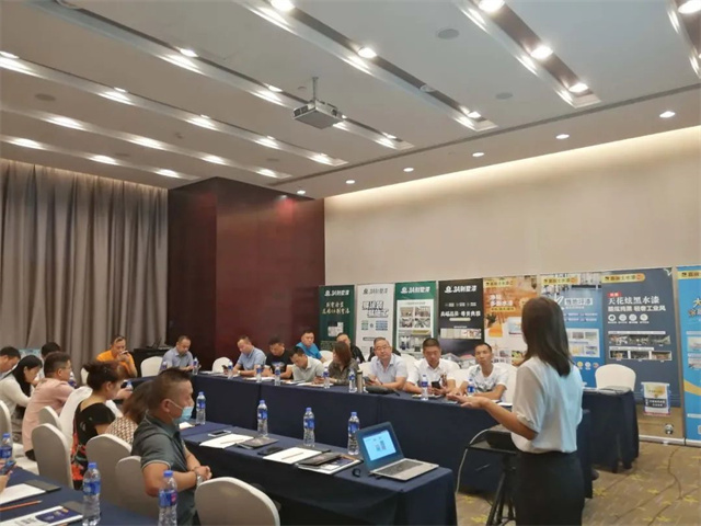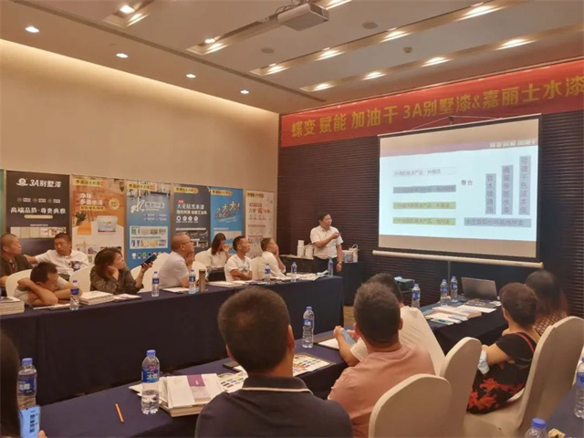 針對新上市的藝術(shù)漆、防水產(chǎn)品線的整合、嘉麗士新上市的商裝麗彩與雙組分地坪漆、膩子粉區(qū)域的完善配套等內(nèi)容進行詳細講解,與會人員一一認真聽取講解,并積極提出疑問,共同探討問題。