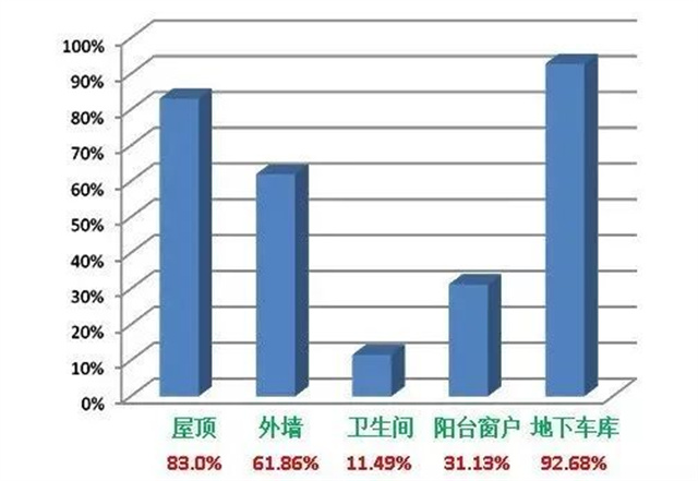 調(diào)查的822戶中,750戶滲漏(屋頂、外墻、陽(yáng)臺(tái)、窗戶、衛(wèi)生間中任意部位)。▼住宅不同部位的滲漏率:屋頂83%,外墻61.86%,衛(wèi)生間11.49%,陽(yáng)臺(tái)、窗戶31.13%,地下車庫(kù)92.68%