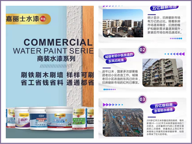 嘉麗士水漆專注于商業(yè)及公共空間涂裝和翻新業(yè)務(wù),包含鐵木墻通刷多面水漆、水性地坪漆、免砸磚防水、黑漆等產(chǎn)品體系。產(chǎn)品水性環(huán)保,無刺激氣味,全方位呵護(hù)健康。施工簡單、周期短,可做到即刷即入住,大大提高了翻新效率。產(chǎn)品可調(diào)千色,保色性好,非常適合老舊小區(qū)改造翻新。