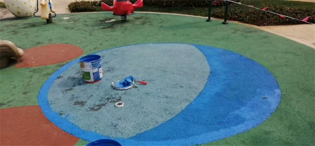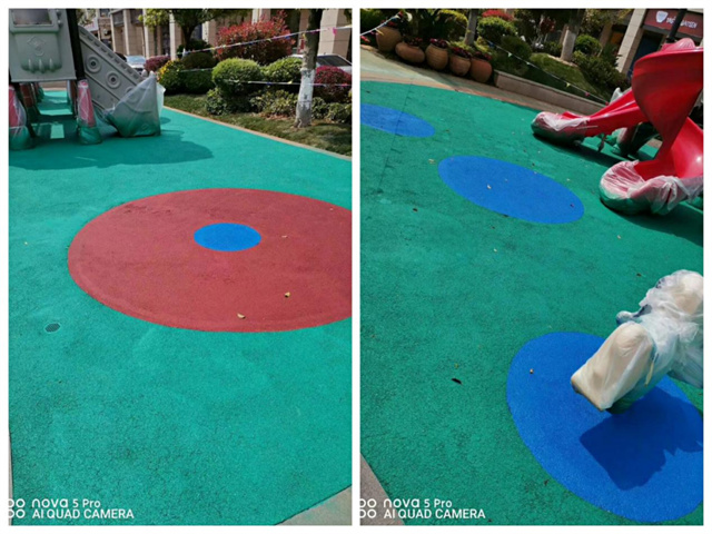 涂裝后的兒童游樂(lè)區(qū)地坪色彩鮮艷,藍(lán)、紅、綠搭配圓形圖案,充分展現(xiàn)了童趣,與周邊游樂(lè)設(shè)施一起,構(gòu)成了充滿(mǎn)夢(mèng)幻童話(huà)的空間!
