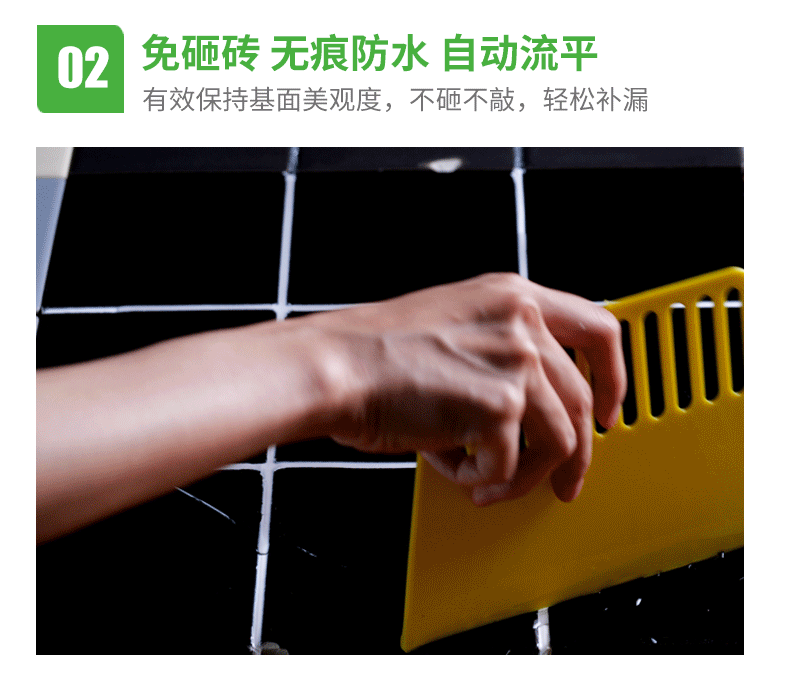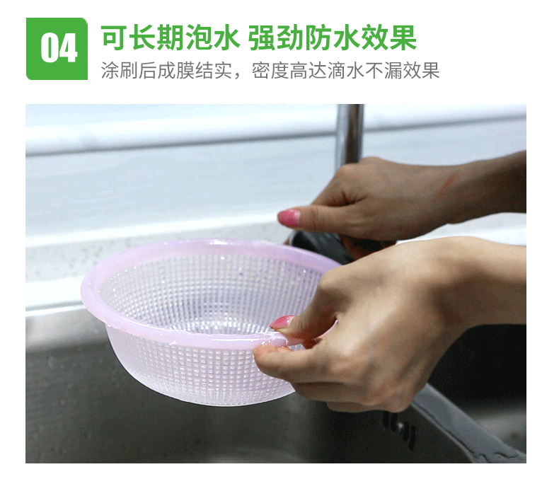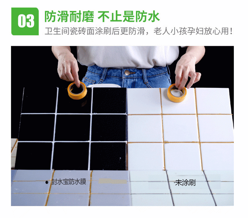 封水寶免砸磚強(qiáng)效耐候防水膜,是以優(yōu)質(zhì)天冬聚脲樹(shù)脂、精選助劑、顏填料、固化劑為改性異氰酸脂組成的雙組份產(chǎn)品,混合后產(chǎn)生交聯(lián)反應(yīng)形成高分子透明防水膜,適用于屋頂,水池、廚房、衛(wèi)生間瓷磚表面滲水修復(fù)、內(nèi)墻表面防水防潮處理,讓你重做防水不砸磚,省時(shí)、省工更省錢(qián)。