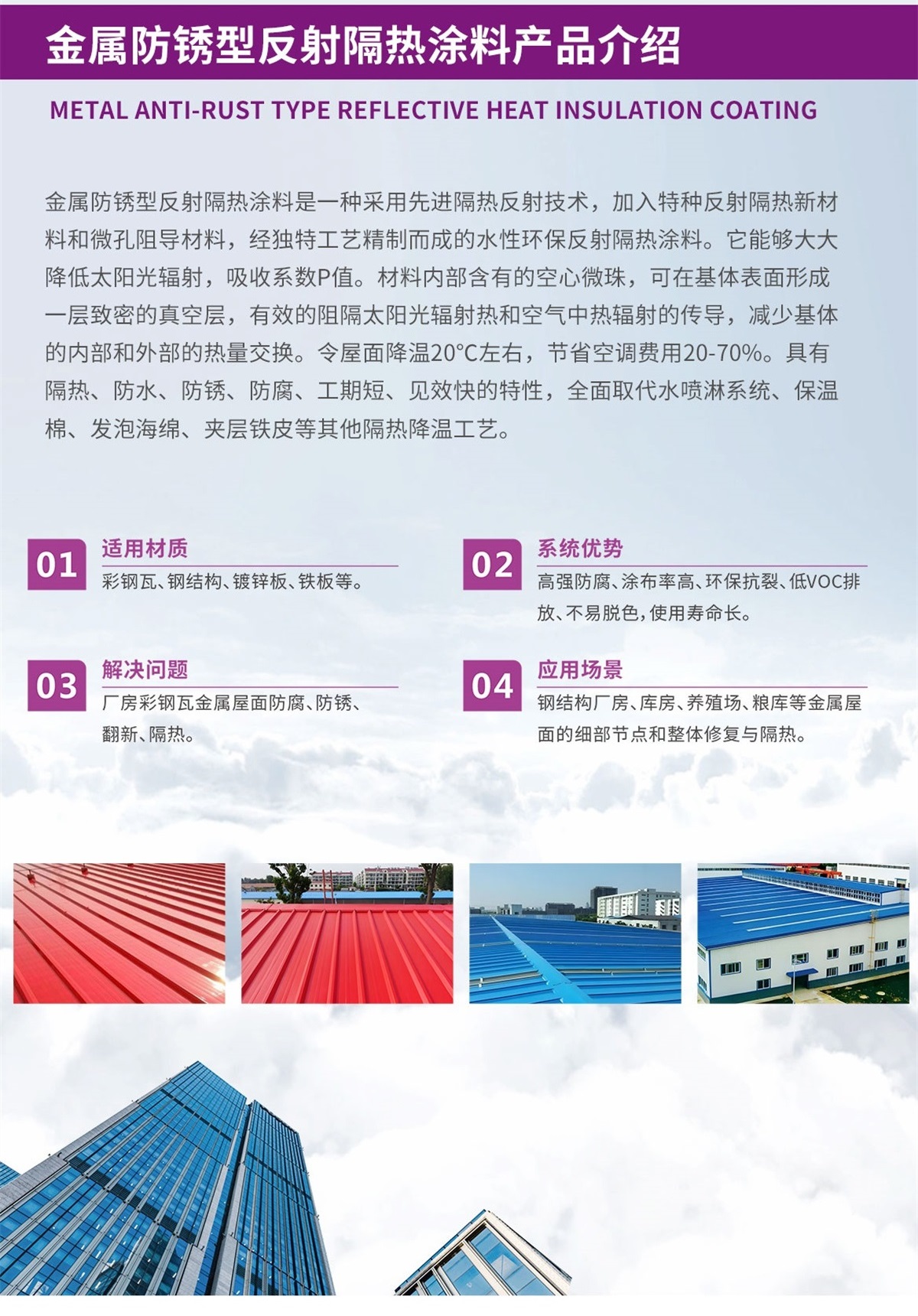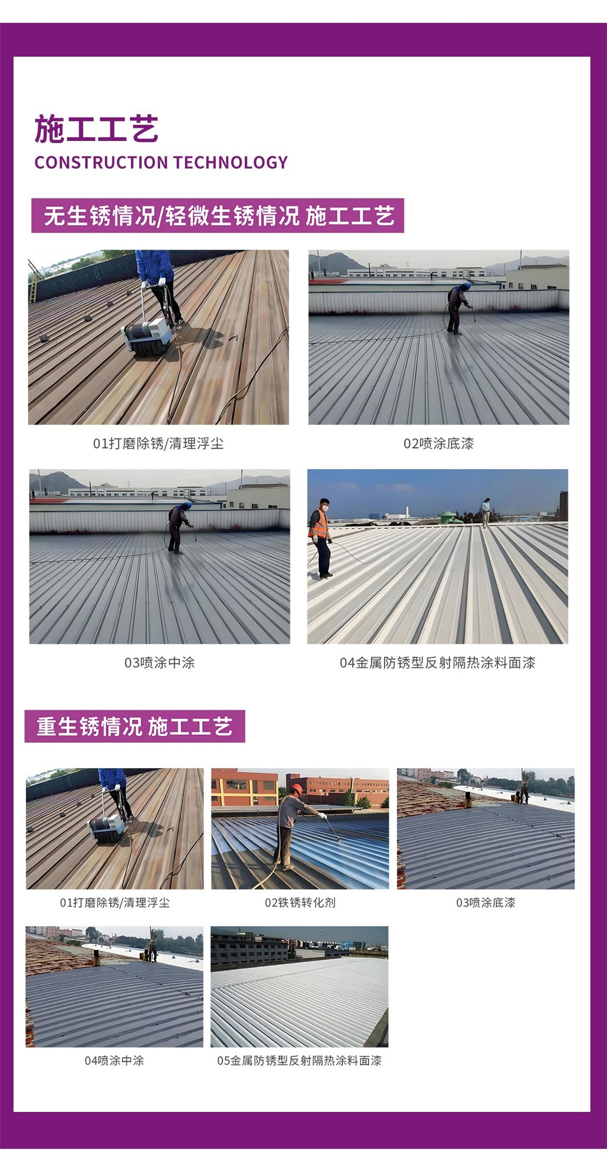3、解決問(wèn)題:廠房彩鋼瓦金屬屋面防腐、防銹、翻新、隔熱。